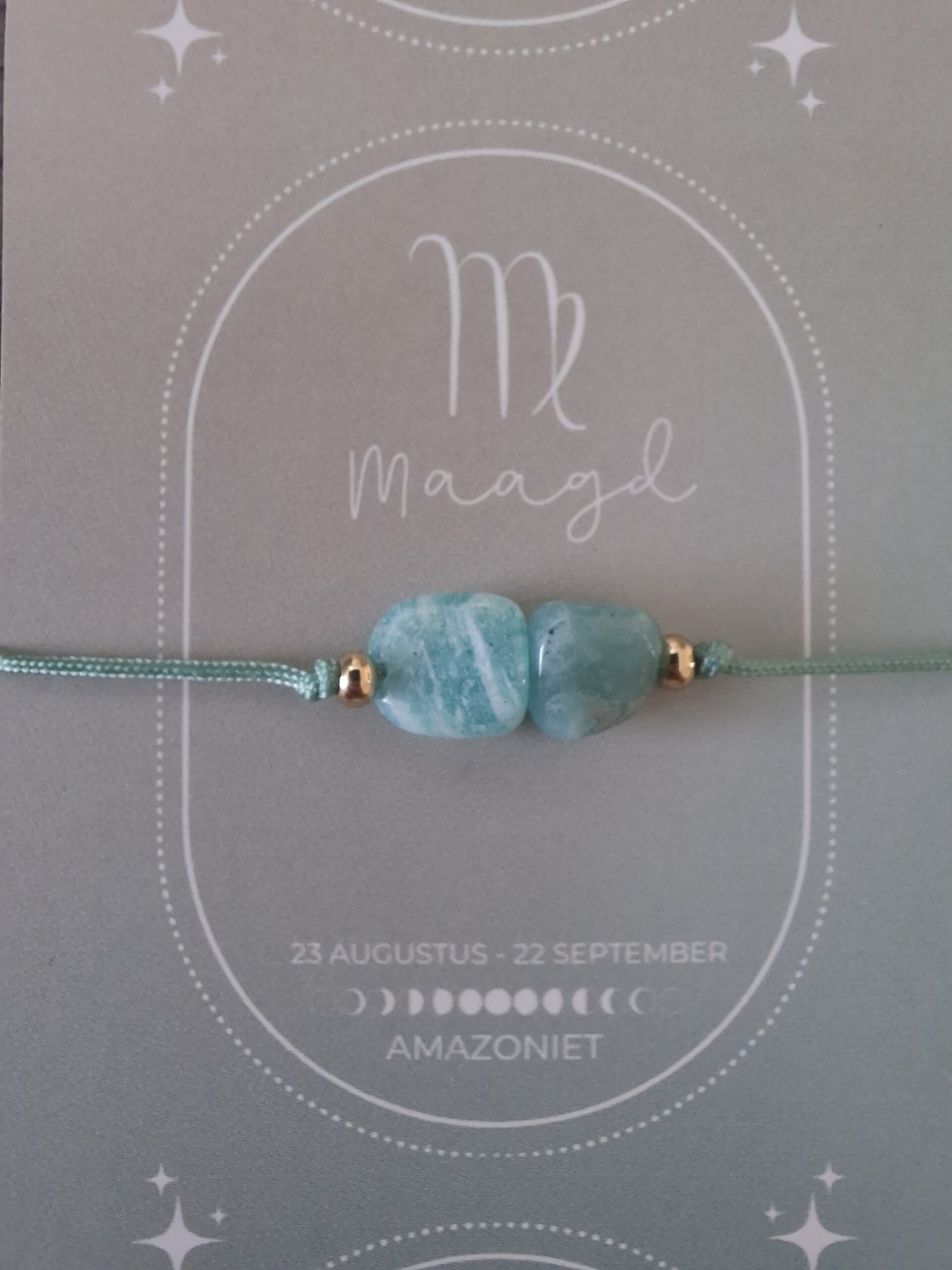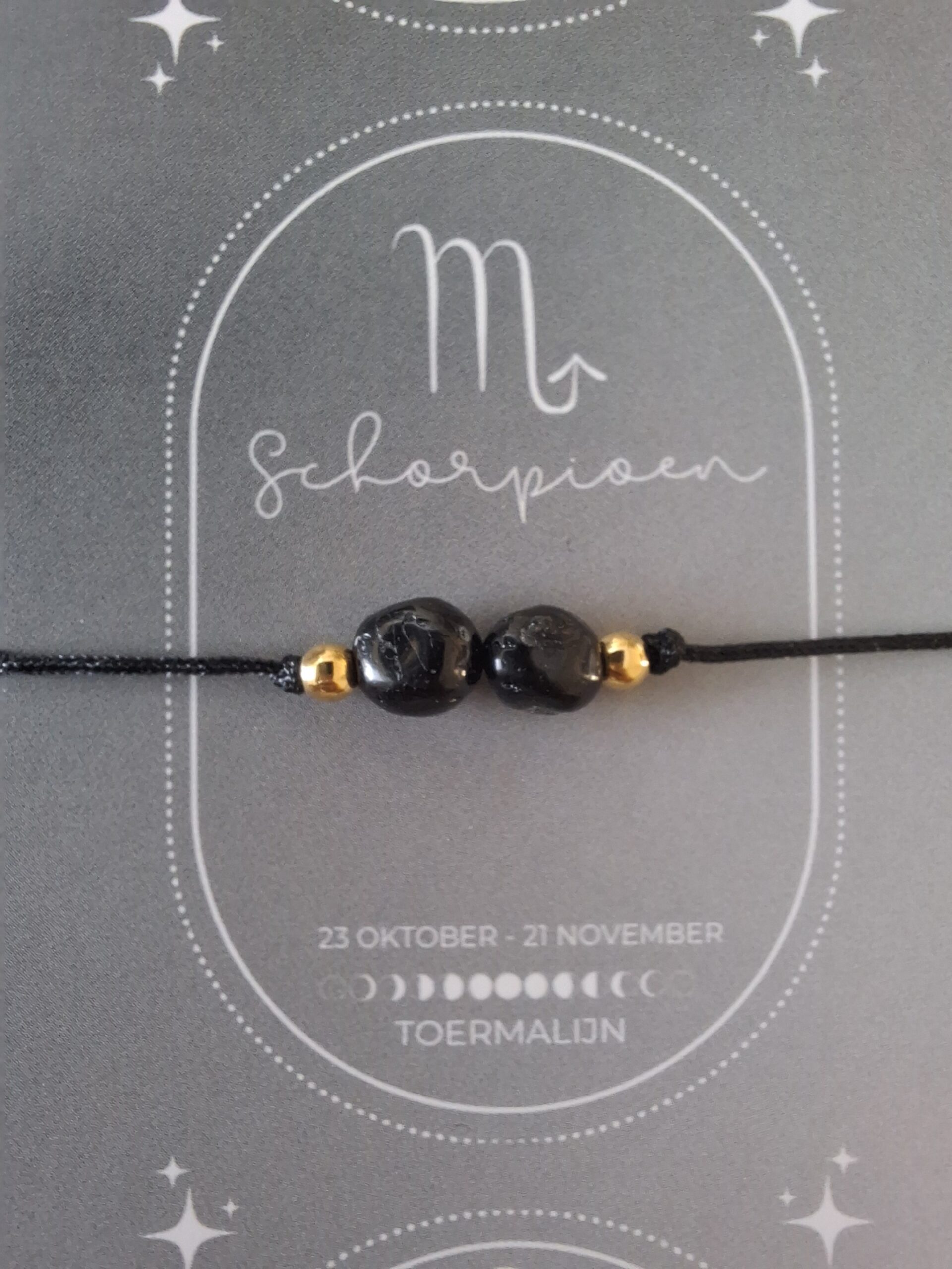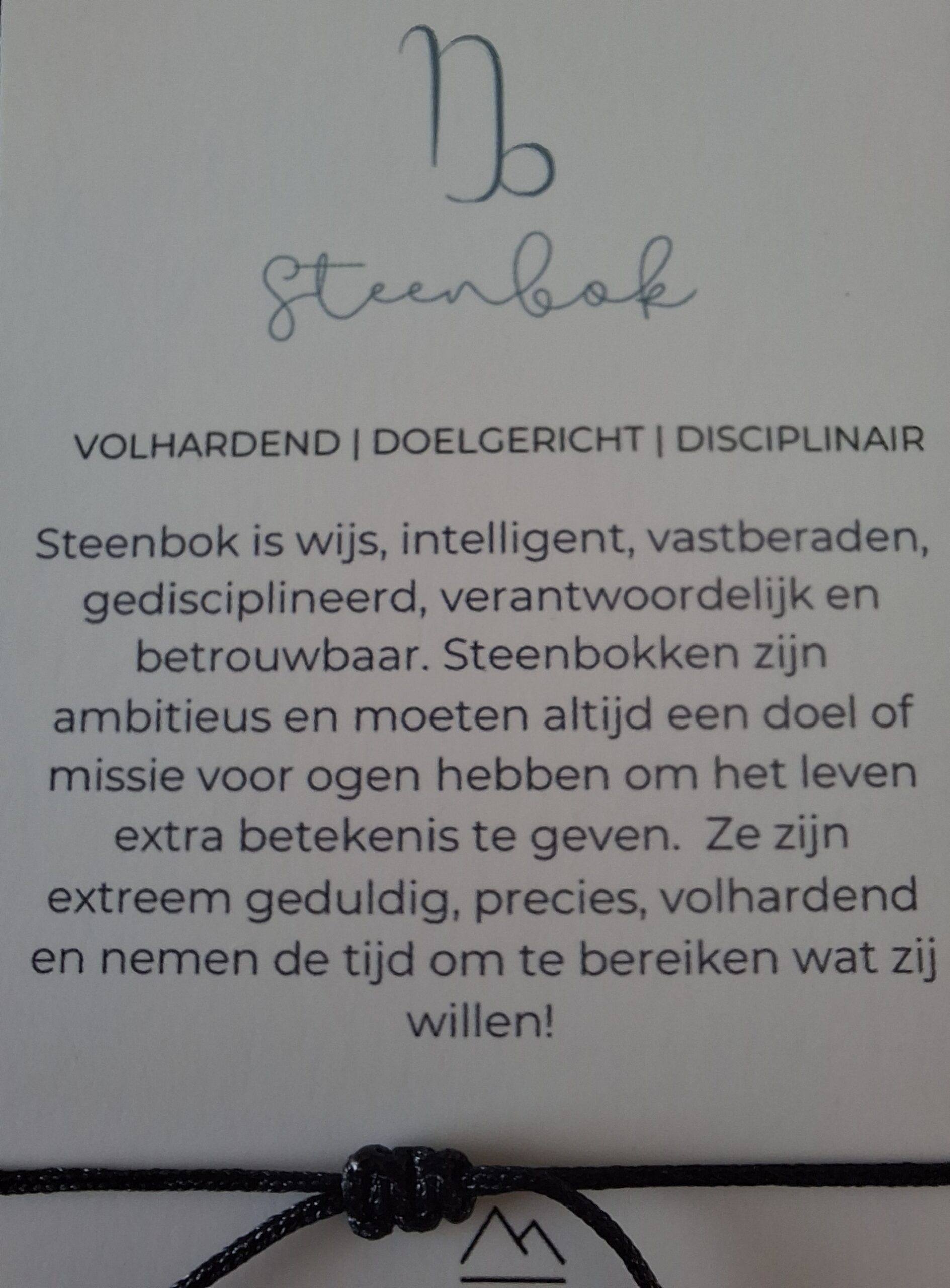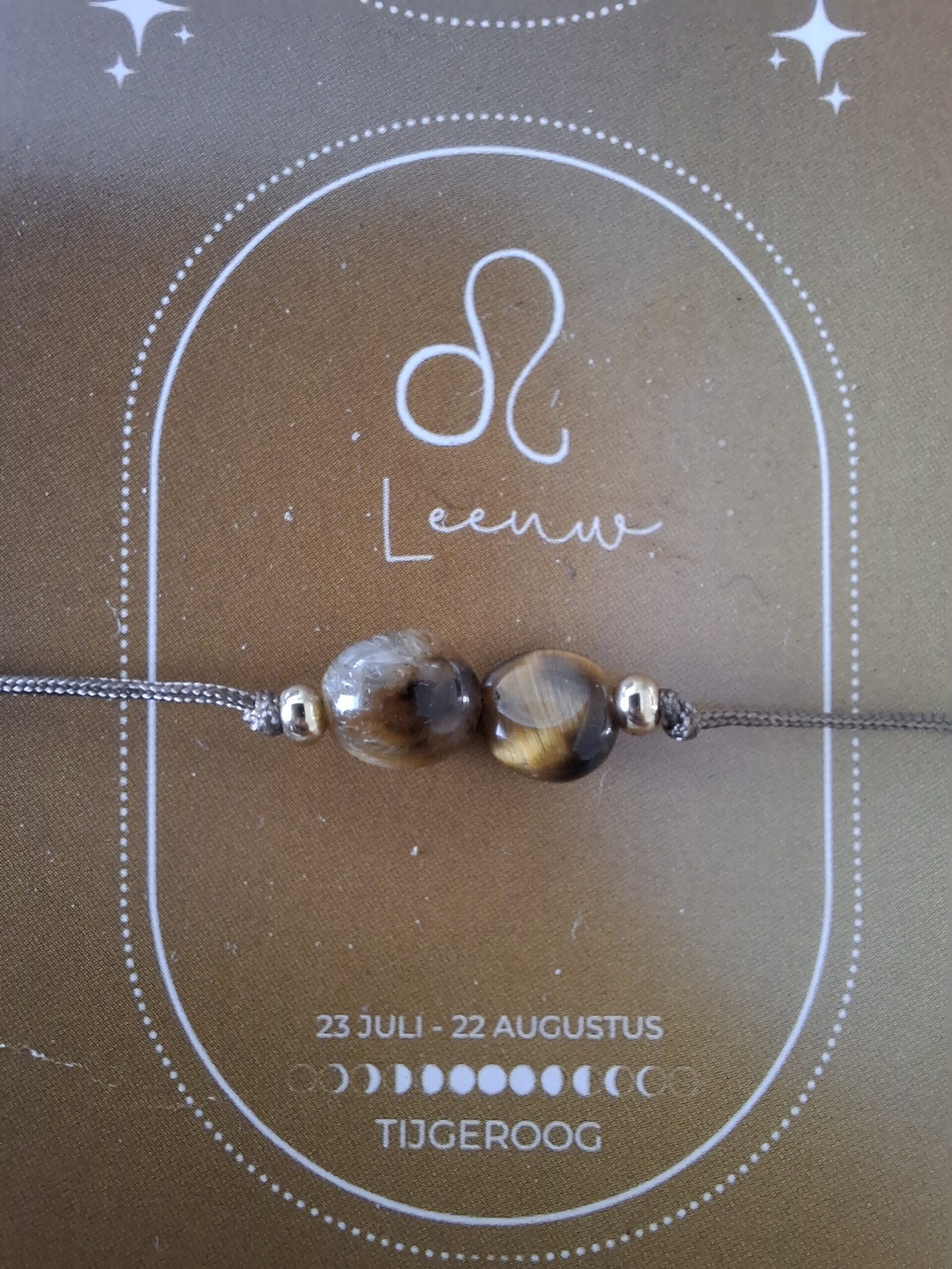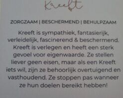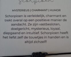 Bij iedere armband ontvang je een bijpassend kaartje: op de voorkant vind je de edelsteen en op de achterkant staat een uitleg van de kracht van de edelsteen én een korte beschrijving van het sterrenbeeld. Zo wordt het sieraad niet alleen een stijlvol accessoire, maar ook een persoonlijke reminder die jou dagelijks inspireert en ondersteunt.